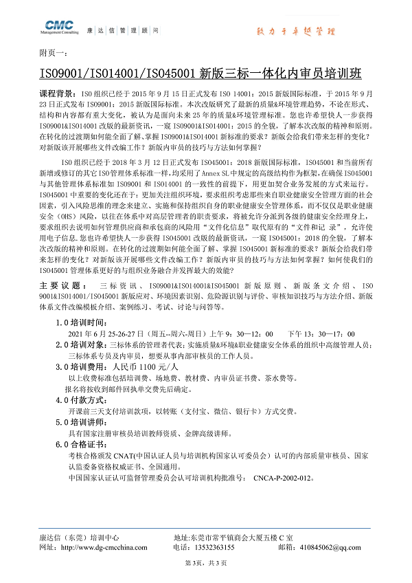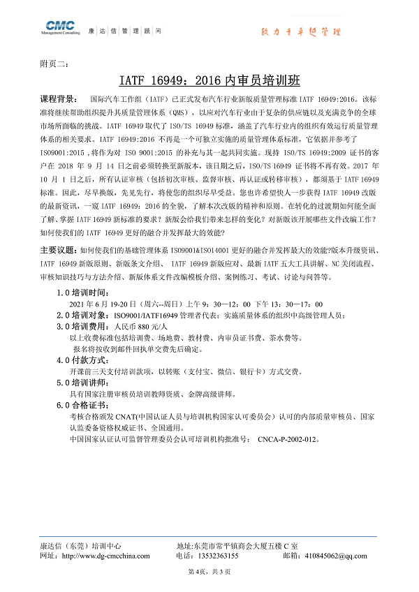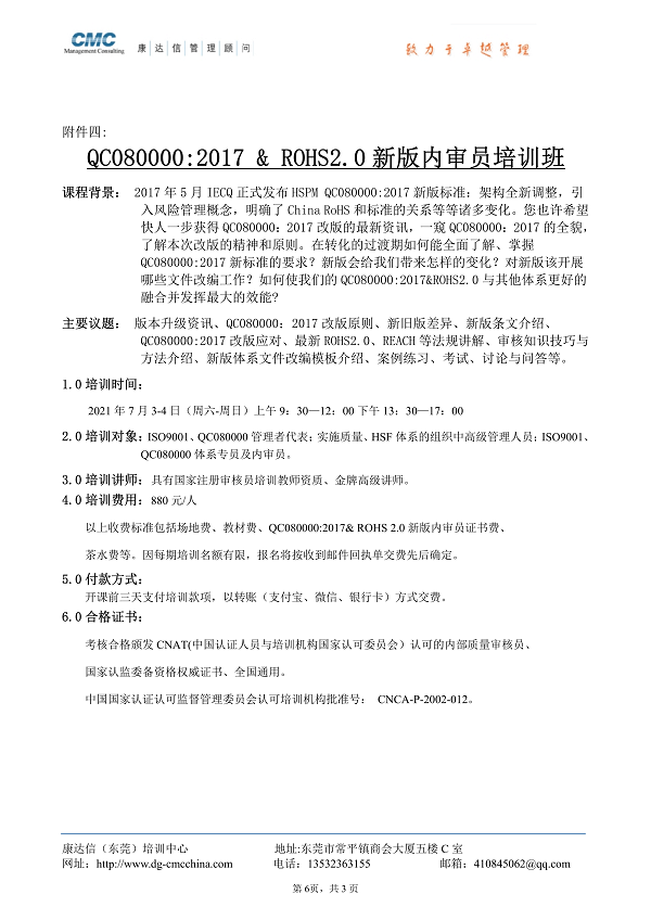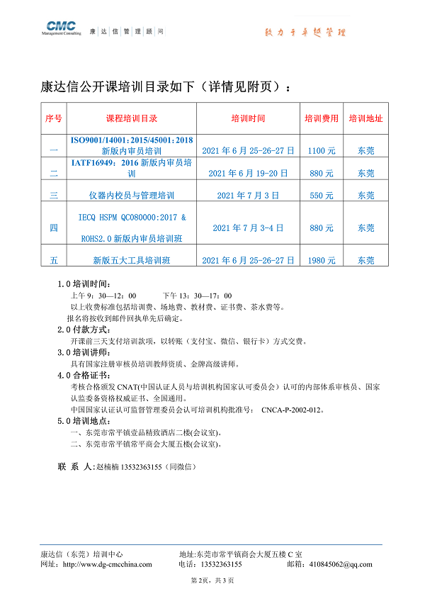 东莞康达信2021年6月份最新培训计划
