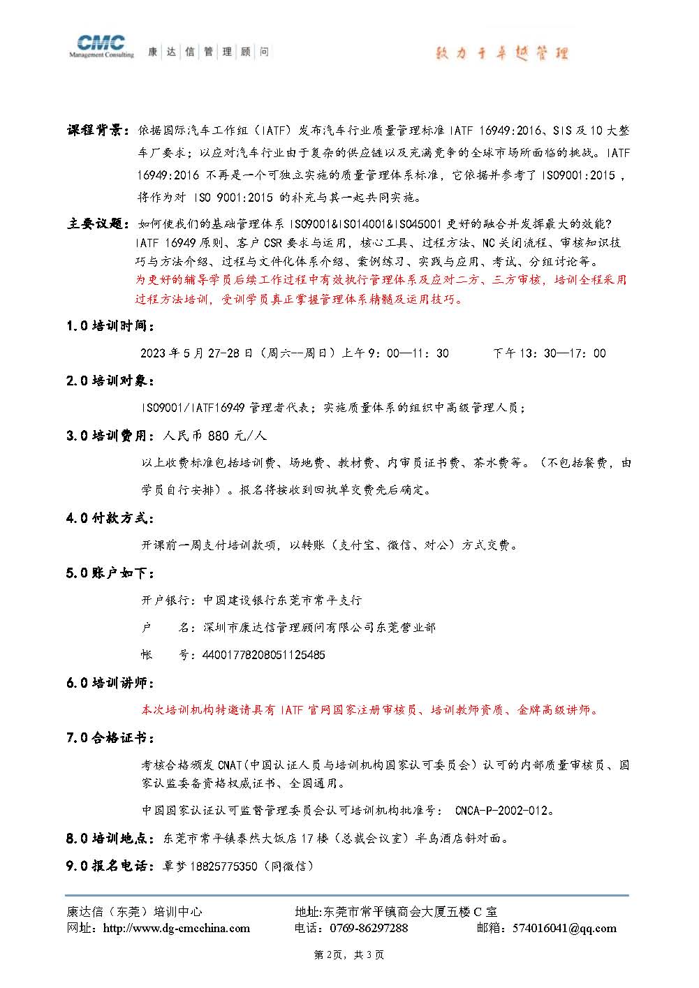 2023年5月27-28日计划举办IATF16949:2016实践应用培训班