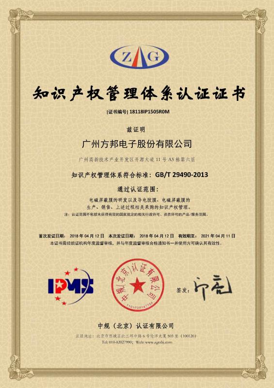 2017年10月,东莞康达信与广州方邦电子股份有限公司签订辅导合约,进行知识产权管理体系认证辅导培训,经过我司老师数月辅导,于4月顺利通过中规(北京)认证有限公司认证并取得证书。