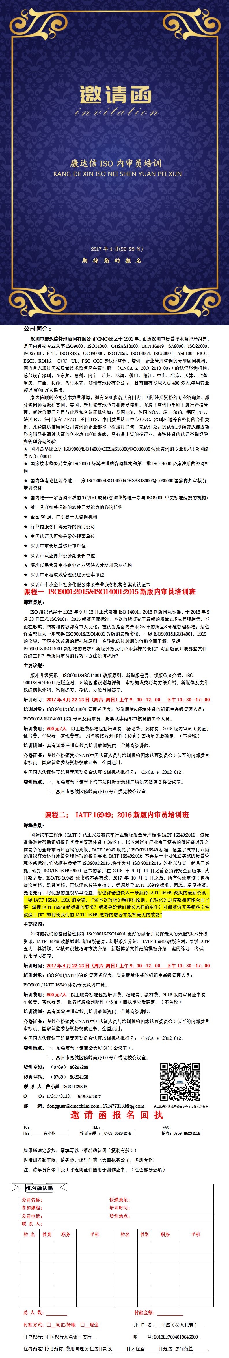 2017年第二期ISO9001/ISO14001/IATF16949新版内审员培训4月份开班啦!