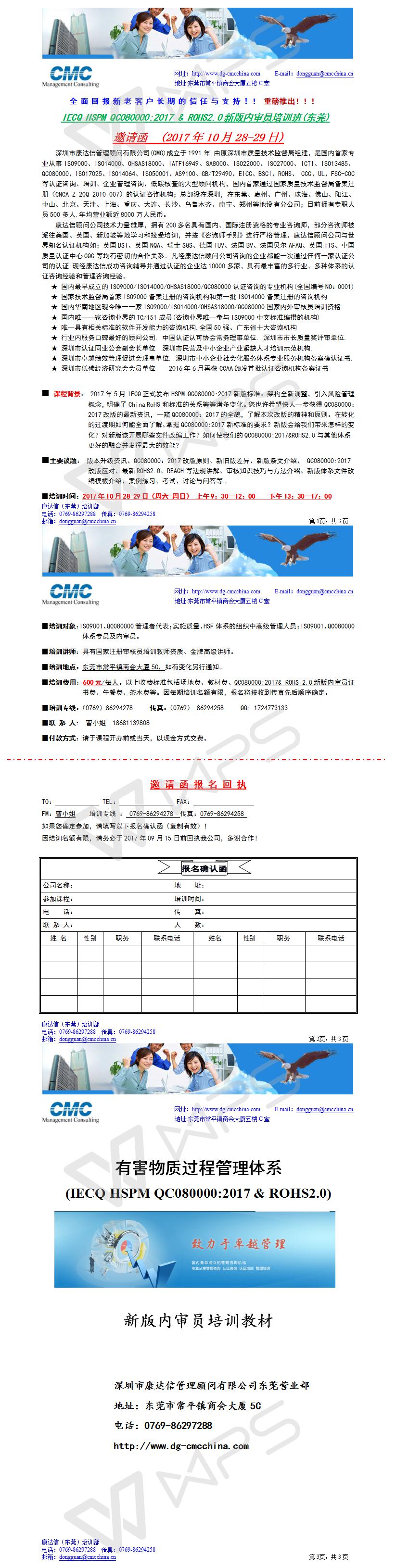 东莞康达信10月重磅推出:IECQ HSPM QC080000:2017 & ROHS2.0新版内审员培训