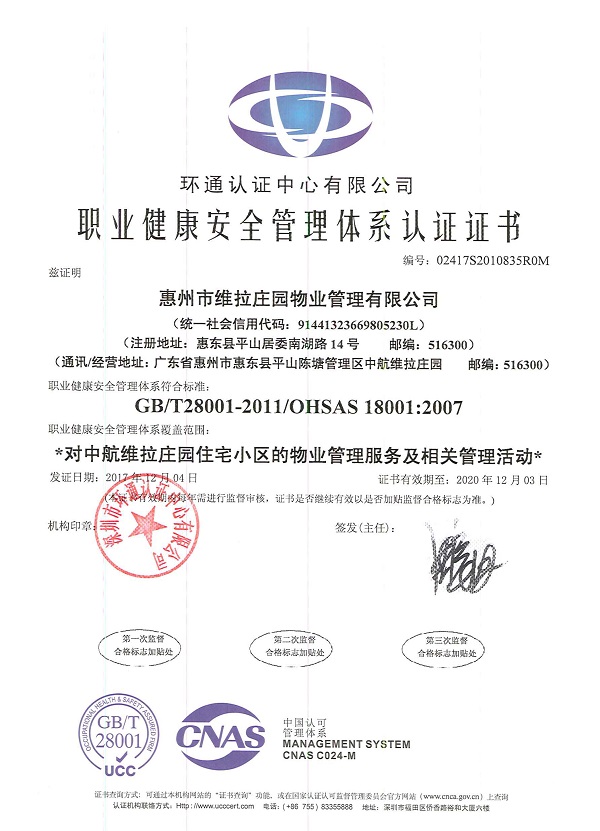 通过我司老师数月现场辅导,对惠州市维拉庄园物业管理有限公司进行了ISO9001:2015/ISO14001:2015/OHSAS18001:2007质量、环境、职业健康安全管理体系培训、文件策划、建立和推行等。2017年12月,惠州市维拉庄园物业管理有限公司顺利通过了三标标准认证!