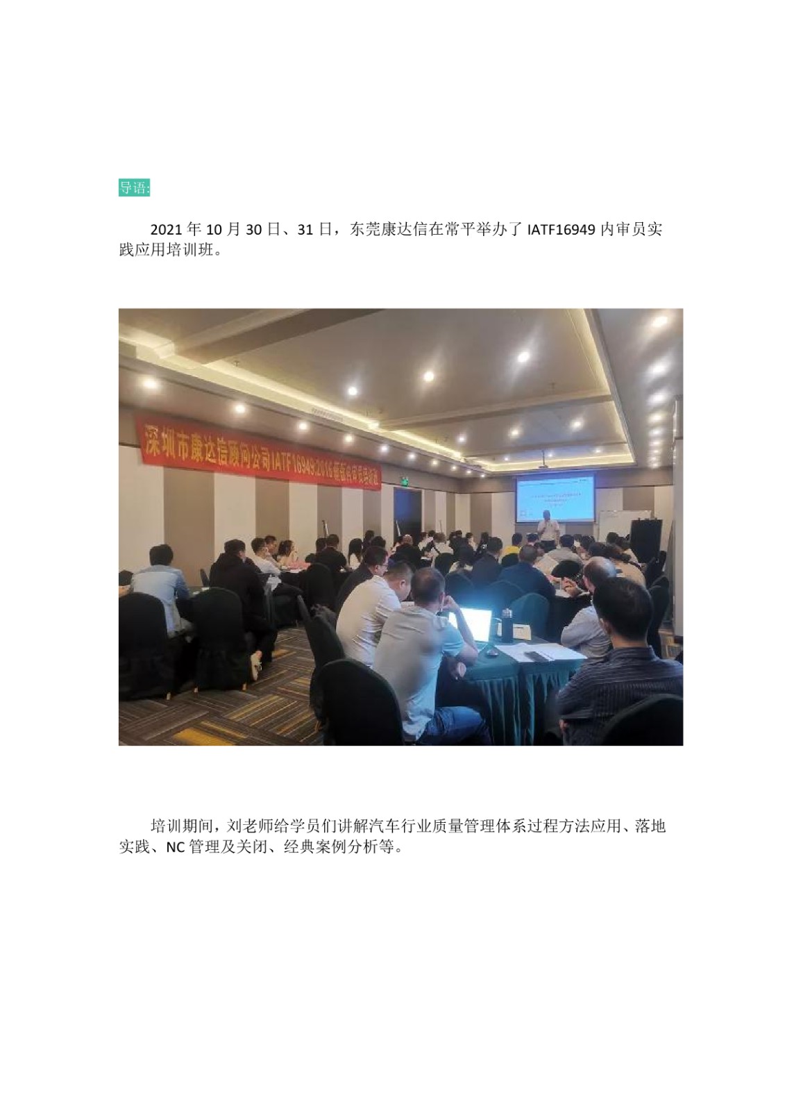 热烈祝贺东莞康达信2021年10月份IATF16949内审员培训圆满结束!!!