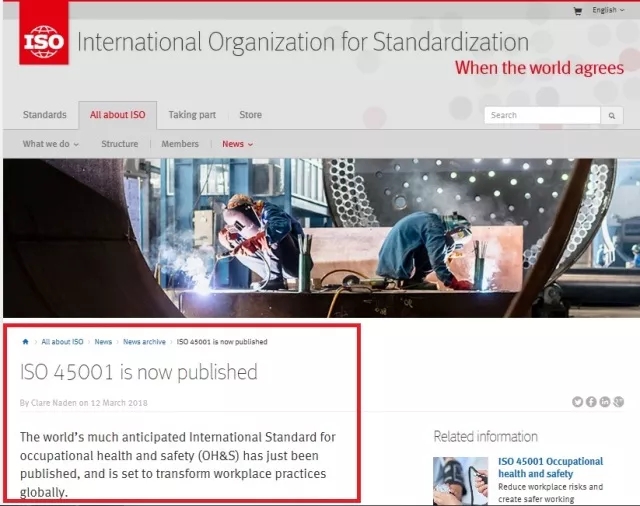 2018年3月12日,国际标准化组织(ISO)发布了职业健康与安全新标准--ISO 45001。该标准将取代OHSAS 18001,已获得OHSAS 18001认证的组织将有三年时间移转至新标准。