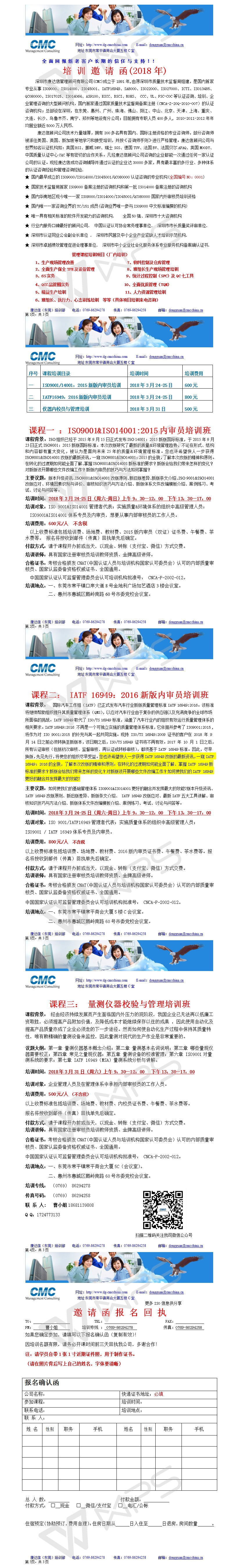 东莞康达信2018年3月内审员培训计划