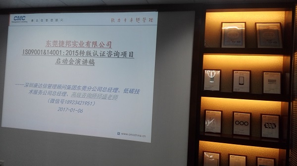 2017年1月6日,东莞康达信与东莞捷邦实业有限公司合作,进行ISO9001-ISO14001:2015双标转版暨优化现场管理培训项目启动!