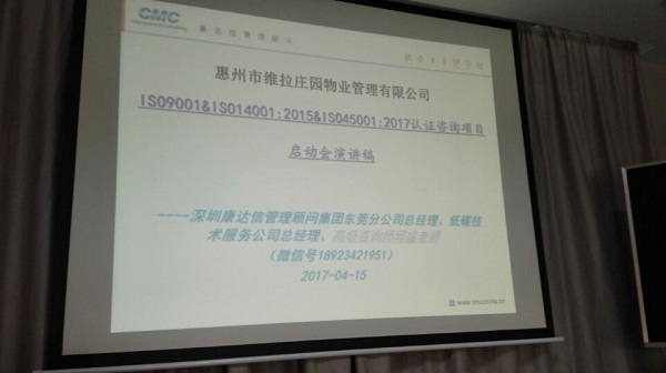 2017年4月15日,东莞康达信和惠州市维拉庄物业管理有限公司合作,进行ISO9001:2015/ISO14001:2015/ISO45001:2017新版体系认证咨询项目启动!