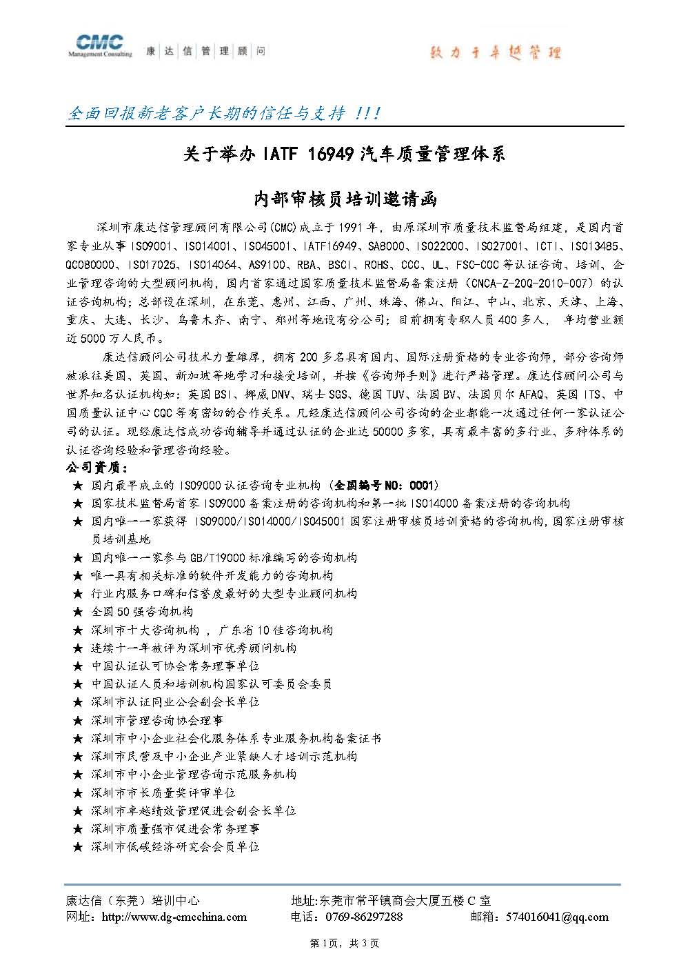 关于举办IATF16949汽车质量管理体系内部审核员培训邀请函