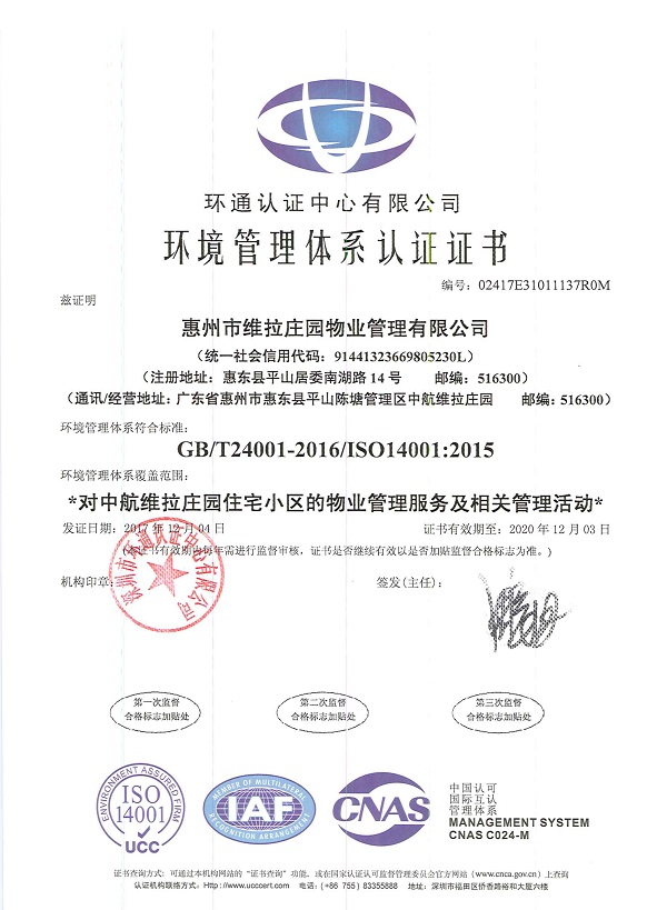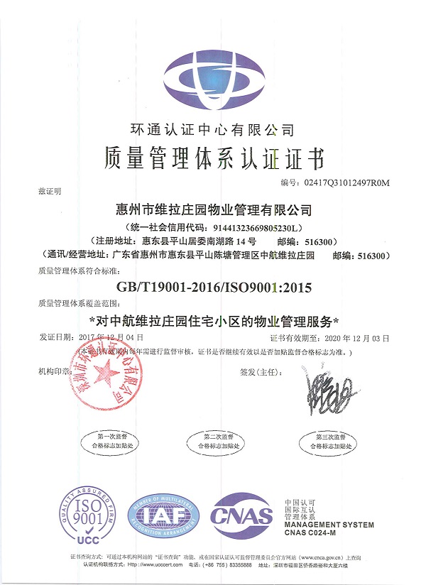 通过我司老师数月现场辅导,对惠州市维拉庄园物业管理有限公司进行了ISO9001:2015/ISO14001:2015/OHSAS18001:2007质量、环境、职业健康安全管理体系培训、文件策划、建立和推行等。2017年12月,惠州市维拉庄园物业管理有限公司顺利通过了三标标准认证!